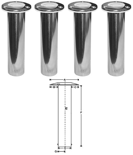 0 Degree Rod Holders, Cast Stainless Steel, Set of 4 THIS LISTING IS FOR A SET OF FOUR ROD HOLDERS. Rod Holder drilled for Three 1/4" fasteners. Oval Flange: 4-1/4" x 3-3/8", I.D. Tube with Liner: 1-5/8". See Dimensional Picture for Reference: A: 4-1/4", B: 1-1/8", C: 1-1/8", D: N/A, E: 2", F: 8-1/4", G: 1"